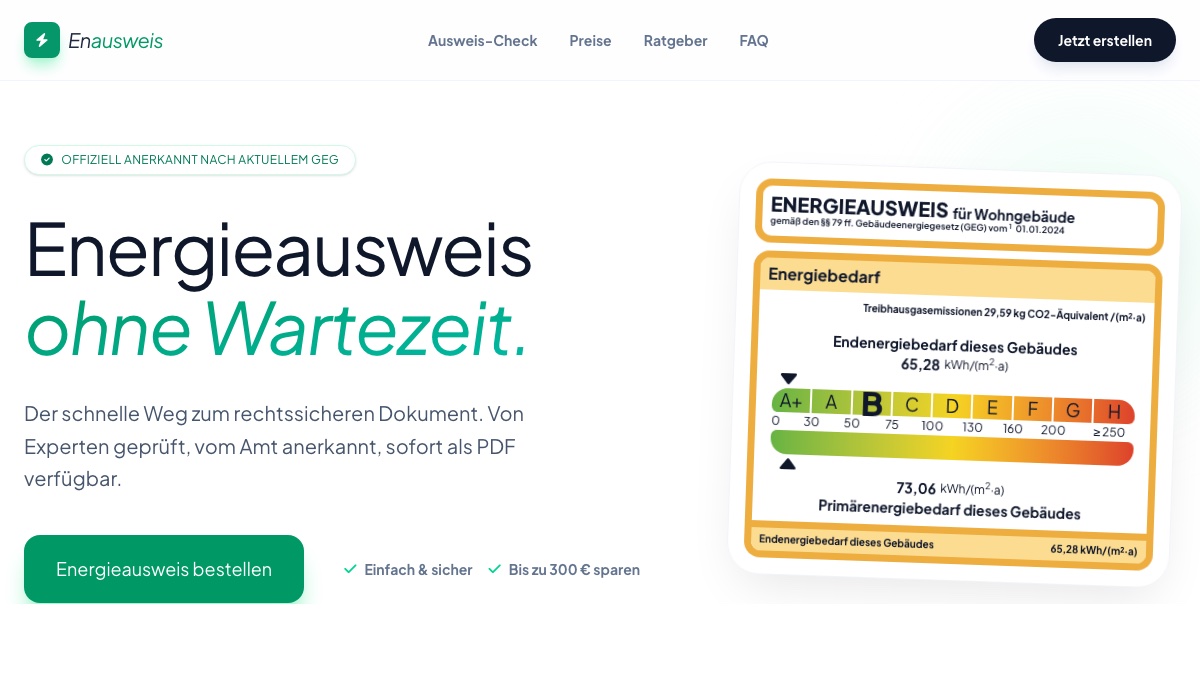 Enausweis is an online platform for creating legally compliant energy certificates (Energieausweise) in Germany. Property owners can generate both consumption-based and demand-based certificates quickly and affordably, with each certificate reviewed by certified energy consultants. The platform guides users through a streamlined process and delivers the officially registered document as a PDF within 24 hours. DotRuby developed the entire platform from the ground up.